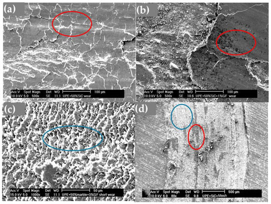 Micrographs of wear tracks: (a) UPE + 50SiC, (b) UPE + 50SiC + 1GF, (c) UPE + 50SiC + 3GF, and (d) UPE + 50SiC + mesh. (Red circles mark areas of agglomerates or deposits, and blue circles mark areas of abrasion and fatigue).
