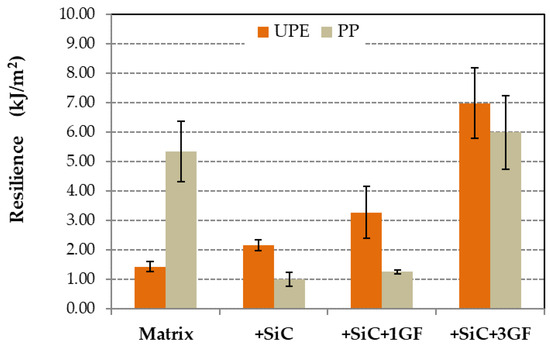 On the other hand, the PP matrix is inherently tough, so adding 50SiC makes it more rigid, reducing energy absorption and, consequently, resilience (Figure 13). Resilience increases again with the addition of GFs.