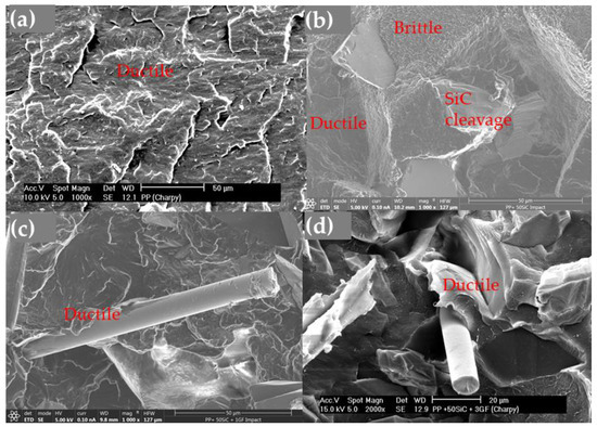 The fracture surfaces of PP exhibited characteristics typical of ductile failure (Figure 14a), showing a deformed aspect. When SiC was added, the fracture surface changed, revealing SiC particles with cleavage and areas with a brittle appearance (Figure 14b). The glass fibers (GFs) in the composites needed to be pulled out and broken, with the PP matrix stretching around the GF (Figure 14c,d), thereby increasing the resilience.