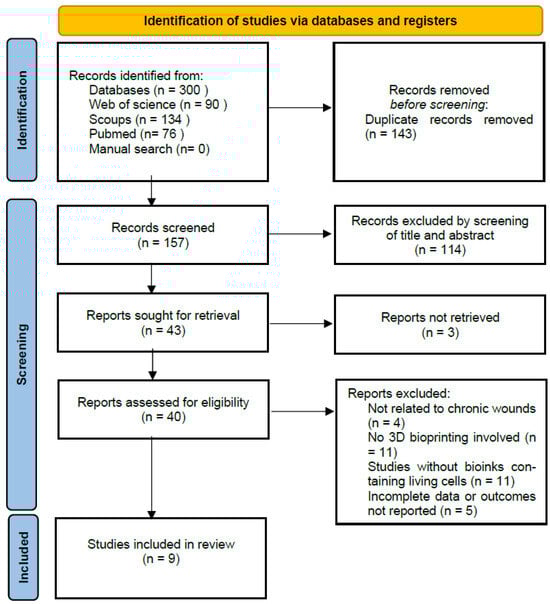 The systematic search and study selection process for our review is illustrated in Figure 1. Initially, a comprehensive search of various databases yielded a total of 300 records, accessed on the 9th of May 2024. The databases included PubMed (n = 76), Web of Science (n = 90), and Scopus (n = 134). From these, we removed 143 duplicate records, resulting in 157 records for initial screening that were screened based on the title and abstract. Of the screened records, 114 were excluded due to being review articles or other publication types that were not original research articles, such as editorials, commentaries, and conferences, or not related to the topic scope. This led to a detailed evaluation of 43 full-text articles to determine their eligibility based on specific inclusion and exclusion criteria. Reasons for exclusion included studies that were not accessible (3), not relevant to the chronic wound topic (4), studies that did not use 3D bioprinting technologies (11), studies not involving bioinks containing living cells (11), and studies not meeting other specific inclusion criteria (5). After screening, 43 full-text articles were assessed for eligibility, of which 31 were excluded. Following this assessment, nine studies were deemed appropriate and were included in the review. These studies primarily focused on the application of 3D printed bioinks in chronic wound healing, adhering to our rigorous inclusion criteria of using living cells within the bioinks and relevance to chronic wound management. The diagram provides a comprehensive overview of the filtering process, ensuring the transparency and reproducibility of our research methodology, as outlined in Figure 3.