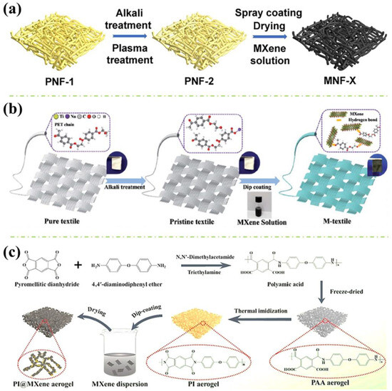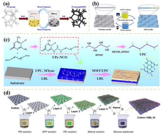 - Yan, B.; Zhou, M.; Yu, Y.; Xu, B.; Cui, L.; Wang, Q.; Wang, P. Orderly self-stacking a high-stability coating of MXene@Polydopamine hybrid onto textiles for multifunctional personal thermal management. Compos. Part A Appl. Sci. Manuf. 2022, 160, 107038. [Google Scholar] [CrossRef]