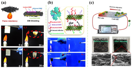 - Jin, X.; Wang, J.; Dai, L.; Liu, X.; Li, L.; Yang, Y.; Cao, Y.; Wang, W.; Wu, H.; Guo, S. Flame-retardant poly(vinyl alcohol)/MXene multilayered films with outstanding electromagnetic interference shielding and thermal conductive performances. Chem. Eng. J. 2020, 380, 122475. [Google Scholar] [CrossRef]
