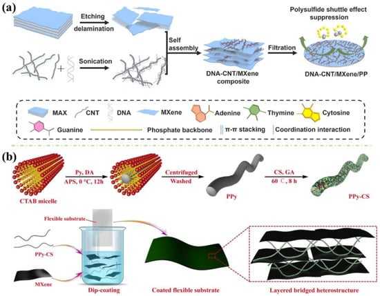 - Li, Y.; Li, M.; Zhu, Y.-C.; Song, S.; Li, S.-N.; Aarons, J.; Tang, L.-C.; Bae, J. Polysulfide-inhibiting, thermotolerant and nonflammable separators enabled by DNA co-assembled CNT/MXene networks for stable high-safety Li–S batteries. Compos. Part B Eng. 2023, 251, 110465. [Google Scholar] [CrossRef]