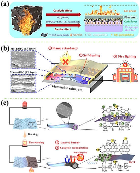 - Wang, B.; Lai, X.; Li, H.; Jiang, C.; Gao, J.; Zeng, X. Multifunctional MXene/chitosan-coated cotton fabric for intelligent fire protection. ACS Appl. Mater. Interfaces 2021, 13, 23020–23029. [Google Scholar] [CrossRef]