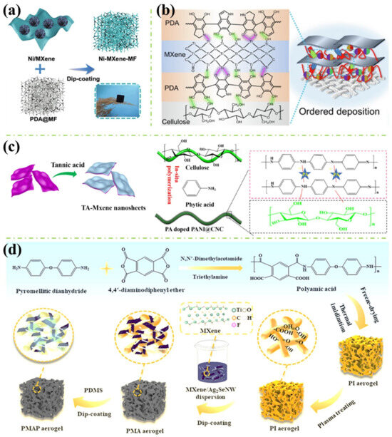 | TA + MXene | Mix + dip-coat | Cotton, PA, PANI, CNC | [56] |
