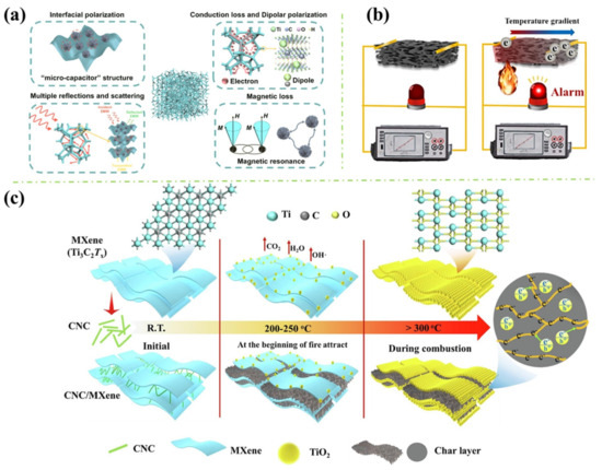 - Zeng, Q.T.; Zhao, Y.; Lai, X.J.; Jiang, C.C.; Wang, B.L.; Li, H.Q.; Zeng, X.R.; Chen, Z.H. Skin-inspired multifunctional MXene/cellulose nanocoating for smart and efficient fire protection. Chem. Eng. J. 2022, 446, 136899. [Google Scholar] [CrossRef]