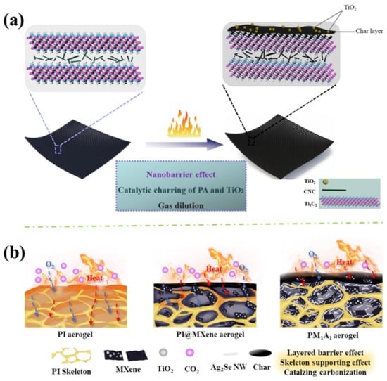 - Zhao, Y.; Chen, J.; Lai, X.; Li, H.; Zeng, X.; Jiang, C.; Zeng, Q.; Li, K.; Wu, Z.; Qiu, Y. Efficient flame-retardant and multifunctional polyimide/MXene composite aerogel for intelligent fire protection. Compos. Part A Appl. Sci. Manuf. 2022, 163, 107210. [Google Scholar] [CrossRef]