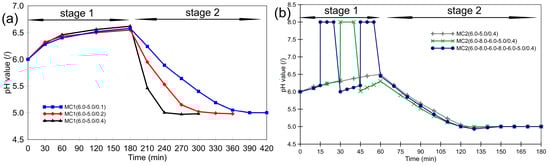 Changes in pH value in (a) the MC1 series and (b) the MC2 series of the microencapsulation experiments.
