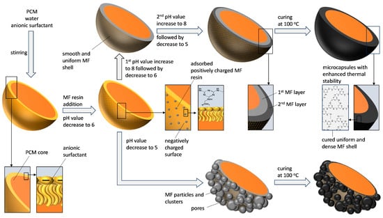 The choice of surfactant used for dispersing the selected PCM is also crucial [48,60,61,62]. To ensure the successful formation of a homogeneous and compact MF shell, the use of anionic emulsifiers is essential. The ionic attractions between the negatively charged head of the anionic surfactant and the positively charged MF resin result in a higher resin concentration at the surface, thereby accelerating the formation of the MF shell [47,60]. A higher MF resin concentration leads to faster polymerization. Additionally, the formation of the MF shell progresses more rapidly at lower pH values. However, excessively acidic conditions can increase the shell porosity and/or produce raspberry-like microcapsule shells [40]. On the other hand, higher pH values during microencapsulation result in a lower degree of crosslinking, producing mechanically unstable and flexible shells that are prone to deformation and cracking [52]. Therefore, establishing a balance between these factors is crucial for producing stable and efficient MF microcapsules.