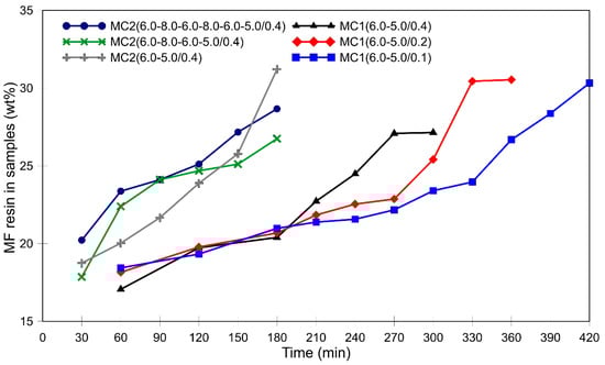 In the MC1 series, the pH value increased spontaneously from 6.0 to 6.5 during the first 180 min (Figure 1a). At these pH values, the formation of MF shell material was relatively slow, as shown in Figure 3. During the second and third hours, the amount of MF resin only increased by about 2–3 wt%. In the second stage, when the pH value was continuously lowered to 5.0, the rate of increase in the weight fraction of MF resin depended on the rate of pH value decrease. A slower decrease in pH value resulted in a higher weight fraction of MF material at the end of the second stage. The slower the pH value dropped, the longer the second stage lasted. After the pH value reached 5.0, the process continued for an additional hour, during which the maximum wt% of MF resin was reached. The increase in the wt% of MF resin in the samples is likely due to the thickening of the shells. Alternatively, it could also be due to the formation of pure MF particles (without the core PCM), which could deposit on the surface of the microcapsules and/or form MF resin agglomerates.