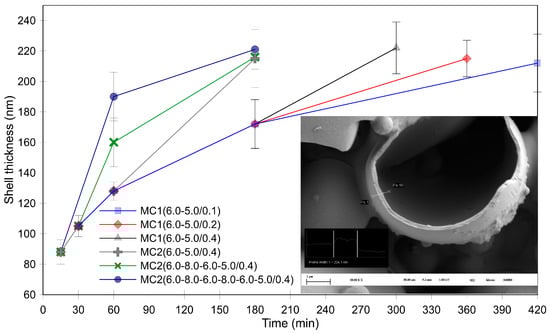 In the next step, we estimated the shell thickness by examining intentionally damaged/broken isolated microcapsules using SEM. The results for the MC1 series (Figure 5) indicated that the shell thickness increased to approximately 170 nm within the first 180 min of the experiment. The final average shell thickness ranged from 210 to 220 nm and was somewhat influenced by the rate of the pH value decrease. A faster decrease in the pH value led to thicker shells. Notably, Figure 3 shows the opposite trend: a slower decrease in the pH value resulted in a higher wt% of MF resin in the isolated product. This observation can be explained by the fact that a rapid pH value decrease prevented a large amount of small, pure MF particles and MF agglomerates from attaching to the microcapsule surface (see Figure 4d–f).