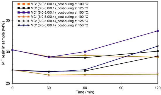 Weight percentage of the MF resin in the products MC1(6.0–5.0/0.1) and MC1(6.0–5.0/0.4) during post-curing under different conditions.