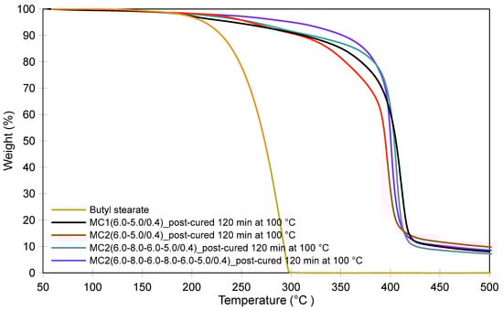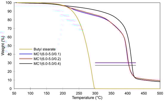 Figure 8 shows the impact of the pH value decreasing from 6.0 to 5.0 on the thermal stability of the MC1 series. At 300 °C, when all of the non-encapsulated core material was completely vaporized, the total weight loss was only 15% or less. The horizontal lines represent the initial amount of shell material in a sample (around 30%). The results indicate that encapsulated butyl stearate is not completely removed from the microcapsules at temperatures below 400 °C. At 500 °C, the observed residue is approximately 10%, which likely corresponds to the remaining MF resin after thermal degradation. Based on our previous findings [64], the residue of pure MF resin at 500 °C is expected to be around 30–33%. Given that our samples contain 30% MF resin, this would account for about 9–10% of the total sample residue, as shown in Figure 8.