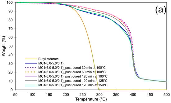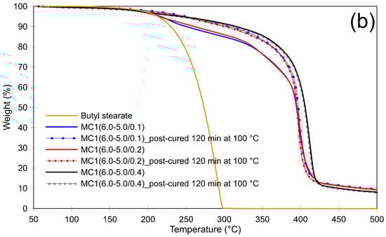As mentioned earlier (Figure 6), exposing MC1 microcapsules to a post-curing temperature of 100 °C resulted in a slight decrease in the wt% of the MF shell. However, when the microcapsules were exposed to temperatures of 125 °C and 150 °C for more than 60 min, there was also a noticeable decrease in the wt% of the core material. These findings align with the TGA data presented in Figure 9a, which illustrate the effects of different post-curing conditions on thermal stability. Post-curing at 100 °C improved the thermal stability of the shells, with no noteworthy impact observed when extending the curing time from 30 to 120 min. Post-curing at 125 °C resulted in a modest increase in thermal stability, though it was not as significant as the improvement observed at 100 °C. Post-curing at 150 °C did not lead to an improvement. During post-curing at elevated temperatures, the following competing processes occur: (i) crosslinking reactions improve the thermomechanical stability of the MF resin; (ii) the transition of butyl stearate from the liquid to the gaseous phase can damage the shells of the microcapsules, particularly during prolonged curing; and (iii) the gaseous core material can migrate through porous shells. Therefore, the benefits of improved crosslinking must be carefully weighed against the potential risks of shell damage and core material loss.
