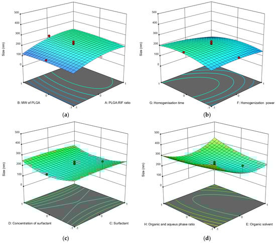 Three-dimensional (3D) response surface diagrams of the impact of independent factors on average particle size: (a) MW of PLGA—PLGA:RIF ratio; (b) homogenization power—homogenization time; (c) surfactant concentration—surfactant; (d) organic phase:aqueous phase ratio—organic solvent.