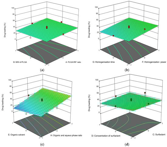 Three-dimensional (3D) response surface diagrams of the impact of independent factors on drug loading: (a) MW of PLGA—PLGA:RIF ratio; (b) homogenization power—homogenization time; (c) organic phase:aqueous phase ratio—organic solvent; (d) surfactant concentration—surfactant.