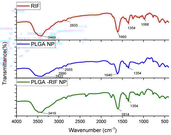 Another equally informative method for identifying the chemical composition of substances is spectroscopy. The comparison of FTIR spectra of PLGA-RIF NPs with individual components can be seen in the figure below (Figure 5).