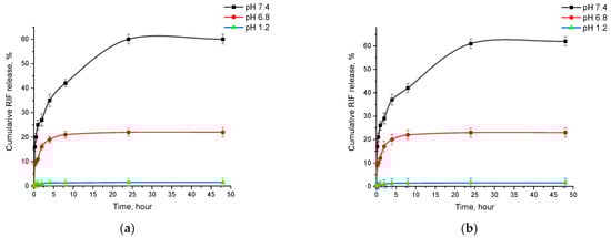 From the obtained Flow-Through Cell method data, it can be seen that the release of rifampicin from the polymer matrix is most efficient under simulated blood plasma conditions (pH 7.4), where a release of approximately 60% in 48 h was achieved. In comparison, under conditions simulating gastric (pH 1.2) and intestinal (pH 6.8) medium, rifampicin release was significantly less efficient (rifampicin release was approximately 1.5% and 23%, respectively), which may be due to the low drug solubility or changes in polymer properties at different pH [43]. Based on the obtained data, it can be concluded that pH has a significant effect on drug release, and the use of an injectable dosage form of the drug, which provides for the direct administration of the drug into the bloodstream, is the preferred option. This method of delivery ensures optimal blood levels of the drug, and it can maximize the therapeutic efficacy with minimal side effects.