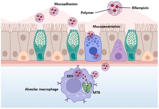 The study of the mucoadhesive properties of nanoparticles is of key importance for the development of effective dosage forms. Figure 7 schematically depicts the mucoadhesion and mucopenetrative processes of NPs during inhaled drug delivery against MTB.