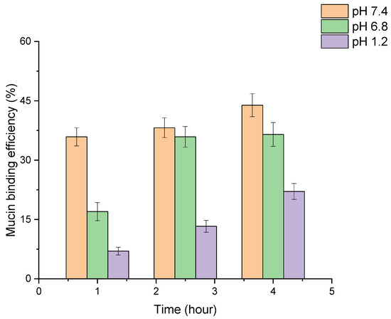 Mucoadhesive nanoparticles can increase the contact time of the drug with mucosal sites, which improves the bioavailability, targeted delivery and controlled release of active ingredients. This is particularly important for drugs that need to be delivered to specific parts of the gastrointestinal (GIT) tract [48,49,50,51,52]. The results of the study of the adhesion of PLGA-RIF NPs to mucin are shown in Figure 8.
