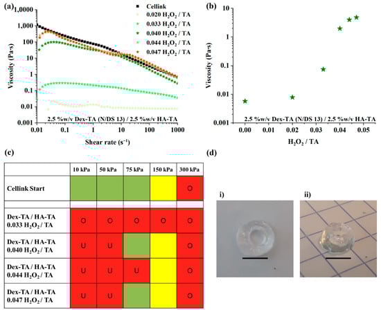 - Petta, D.; Grijpma, D.W.; Alini, M.; Eglin, D.; D’este, M. Three-Dimensional Printing of a Tyramine Hyaluronan Derivative with Double Gelation Mechanism for Independent Tuning of Shear Thinning and Postprinting Curing. ACS Biomater. Sci. Eng. 2018, 4, 3088–3098. [Google Scholar] [CrossRef]