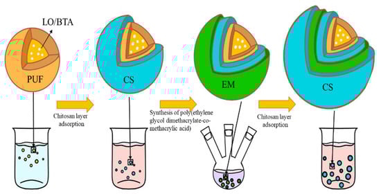 - Construct the polyelectrolyte layer: The chitosan clarification solution with a concentration of 1.5 mg/mL was prepared first. We dispersed the microcapsules in 25 mL of chitosan solution with a concentration of 1.5 mg/mL and soaked them at 30 °C for 20 min. We added the microcapsules to a three-neck round-bottomed flask and added 5 mL of acetonitrile and 0.0068 g of α-methacrylic acid. We sealed the three ports of the flask and stirred magnetically at room temperature for 30 min. Afterwards, 5 mg of free radical initiator 2,2′-azobisisobutyronitrile and 0.0495 g of cross-linking agent ethylene glycol dimethacrylate were added to the solution, and stirring was continued for 30 min. The mixture was heated in a water bath at 60 °C for 8 h under a nitrogen atmosphere to form poly(ethylene glycol dimethacrylate-co-methacrylic acid) (EM). After cleaning the microcapsules with deionized water and ethanol, we added 25 mL of chitosan solution and soaked them at 30 °C for 20 min to obtain acidic pH-responsive microcapsules. Figure 1 is a schematic diagram of the process and structure of the microcapsules prepared in this experiment.