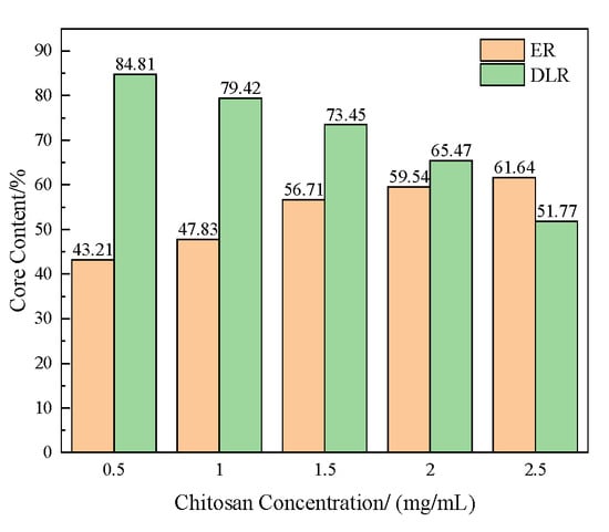 It can be seen that as the concentration of chitosan increases, the encapsulation rate of microcapsules shows a trend of increasing first quickly and then slowly, while the drug loading rate continues to decrease. This is because when the chitosan concentration is low, there is less positively charged chitosan attached to the microcapsules, making layer-by-layer assembly difficult. The resulting microcapsule wall layer is overall thin and easily damaged. When the chitosan concentration is too high, the stability of the microcapsules increases to the upper limit, but the wall thickness continues to increase, and the core-to-wall ratio is too low.