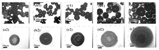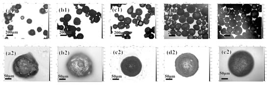 It can be seen that when the temperature is too low (Figure 8(a1,b1)) or too high (Figure 8(e1)), excess impurities are produced. This is because when the polymerization temperature is too low, the initiator decomposes slowly and the number of free radicals in the solution is small. It is difficult for monomers to polymerize into a completely negatively charged polymer layer, and the microcapsules have poor stability. If the temperature is too high, the free radicals in the solution react rapidly with the monomers, forming excess macromolecular free radicals. Some macromolecular free radicals react with each other to form stable polymers, which then adsorb chitosan to form polyelectrolyte particles.