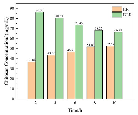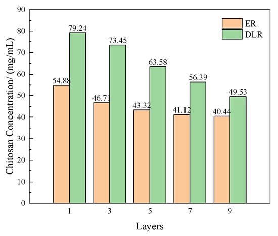 The cumulative release rate of the microcapsules decreases with the increase in the pH value. This is because when the environment is acidic, chitosan will be protonated, causing electrostatic repulsion between the polymers to become loose, allowing the core material to be released through the pores. As the concentration of chitosan continues to increase, the microcapsules become more sensitive to pH stimulation.