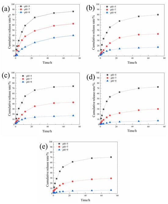 The sustained release curves of the acidic pH-responsive microcapsules prepared when the polymerization time is 2 (a), 4 (b), 6 (c), 8 (d), and 10 (e) h.