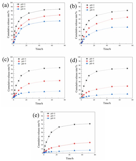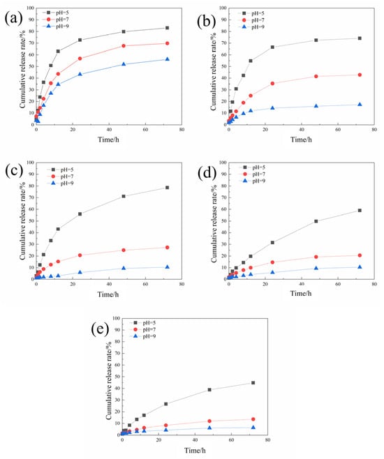 Sustained release curves of acidic pH-responsive microcapsules prepared at heating temperatures of 30 (a), 45 (b), 60 (c), 75 (d), and 90 (e) °C.
