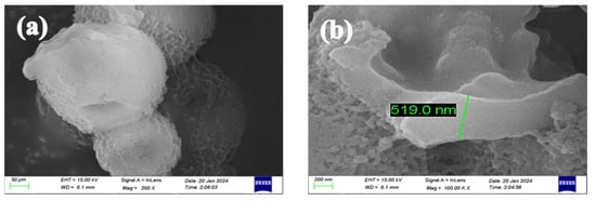 It can be seen that in the range from 2 to 8 h, the polymerization time has a greater impact on the morphology of the microcapsules. When the polymerization time is short, the particle size distribution of the microcapsules is uneven, and there are a large number of adhesions and lumps on the surface (Figure 5a,b). This is due to the inability of the polymer produced during the reaction to completely encapsulate all of the microcapsules. At the same time, because the surface of the microcapsules does not have sufficient negative charges, excess chitosan precipitates during the layer-by-layer assembly process. As the polymerization time increases, the sphericity and dispersion of the microcapsules are good, which is due to the cross-linking of α-methacrylic acid on the surface of the microcapsules to form a dense polymer layer.