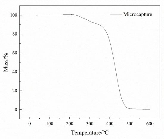 TGA was performed using a TGA/DSC 3+ thermogravimetric analyzer (METTLER TOLEDO, Zurich, Switzerland). The test conditions were as follows: using air as the reference gas, in a nitrogen environment, the microcapsules were slowly heated from 30 °C to 600 °C at a speed of 10 °C/min.