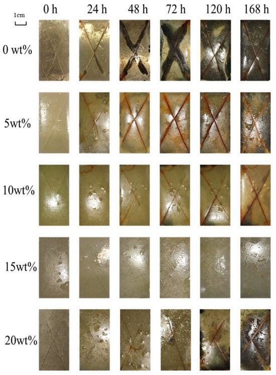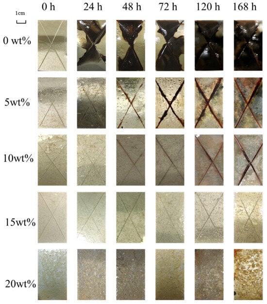 To explore the difference between acidic pH-responsive self-healing anti-corrosion coatings and ordinary self-healing coatings, coatings with the same microcapsule content were prepared and tested in long-cycle salt spray experiments. The test duration was 336 h in total, and the samples were taken out for observation at 0 h, 24 h, 72 h, 120 h, 168 h, and 336 h. The results are shown in Figure 23.