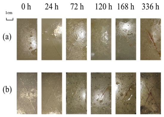We placed the sample into a salt spray box with the scratched side facing up at an angle of 30° to the ground and exposed it to a neutral (pH = 6.5~7.2) or acidic (pH = 5) salt spray environment. The temperature inside the salt spray box was 35 °C, the salt spray solution used was a 3.5 wt% sodium chloride solution, and the average collection rate of the salt spray solution was 1.4 mL/h [32].