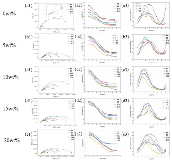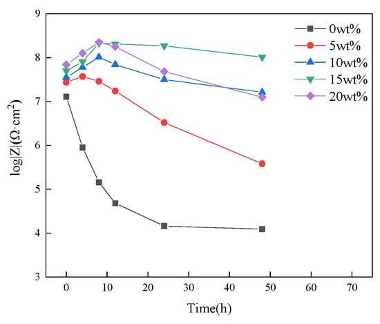 To quantitatively study the anti-corrosion performance of the acidic pH-responsive self-healing coating, this experiment tested the change in the impedance spectrum of the microcapsule coatings containing 0 wt%, 5 wt%, 10 wt%, 15 wt%, and 20 wt% with soaking time. The test method is shown in Section 2.4.3. The results are shown in Figure 24.