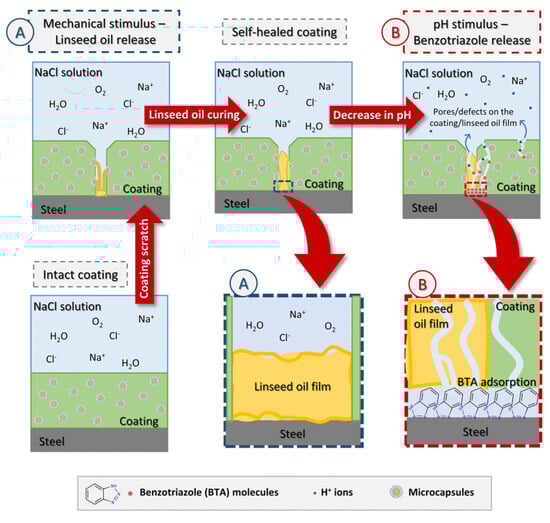 A schematic representation of the active corrosion protection mechanism provided by the coating loaded with microcapsules [39].
