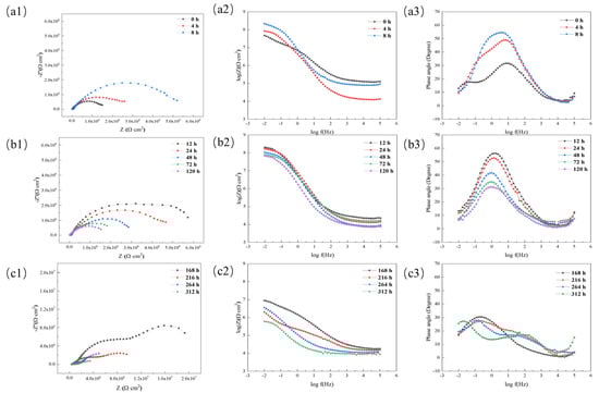 To further study the changes in the anti-corrosion performance of the acidic pH-responsive self-healing coating over a long period, this experiment extended the immersion time to 312 h. The impedance spectrum of the 15 wt% coating was tested at 0 h, 4 h, 8 h, 12 h, 24 h, 48 h, 72 h, 120 h, 168 h, 216 h, 264 h, and 312 h. The results are shown in Figure 27.