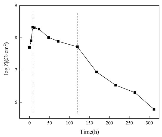 Low-frequency impedance value of acidic pH-responsive self-healing coating during long-term immersion experiment.