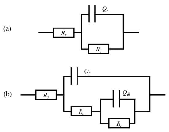Equivalent circuit diagram during corrosion process of acidic pH-responsive self-healing coating: (a) self-repair stage, (b) failure stage.