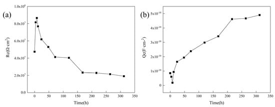 In the equivalent circuit, Rs represents the resistance of the solution system, and RC and QC represent the coating resistance and coating capacitance, corresponding to the time constant at the low-frequency end of the impedance spectrum. Rt and Qdl represent the charge transfer resistance and double-layer capacitance of the electric double layer, corresponding to the time constant at the high-frequency end of the impedance spectrum. The electrochemical parameter fitting results obtained by fitting according to Figure 29 are shown in Table 1. To more intuitively display the penetration behavior of corrosive media in different corrosion stages, the changes in coating resistance and coating capacitance over time are plotted, as shown in Figure 30.