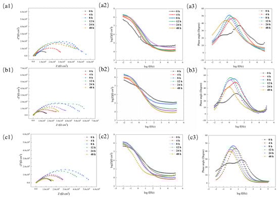 Nyquist plots and Bode plots of acidic pH-responsive self−healing coatings at different times under different pH environments: (a) pH = 5; (b) pH = 7; (c) pH = 9.