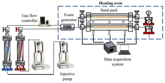 Heavy oil reservoirs are widely distributed around the world, with an estimated total reserve of 9–13 trillion tons []. One of the primary methods for enhancing heavy oil recovery is steam injection development [,]. To expand the steam sweep efficiency, a large amount of steam is typically required, which significantly increases energy consumption []. Previous studies have shown that adding non-condensable gases, such as nitrogen, during steam injection can effectively expand the steam sweep efficiency and accelerate the advancement of the steam front in heavy oil [,]. However, due to the high mobility ratio between gas and heavy oil, gas breakthrough often occurs rapidly. Foam, as a widely used technique for controlling gas flow in oil recovery processes, can mitigate the issue of steam channeling under the influence of non-condensable gases [,]. Injecting nitrogen foam at the steam front can effectively improve the utilization efficiency of the steam’s thermal energy [].