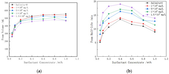 The effects of salt solutions with different concentrations on foam characteristics: (a) foam volume; (b) foam half-life. (50 °C).