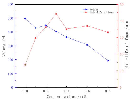The addition of the polymer had a negative impact on the foaming ability of CHSB, and the foam volume decreased rapidly with increasing polymer concentration. This is because the Z364 polymer competes with CHSB molecules for adsorption at the gas–liquid interface, reducing the effective concentration of CHSB molecules. Furthermore, the increase in polymer concentration raises the viscosity of the solution, which in turn increases the energy required to form the gas–liquid interface []. The higher viscosity of the solution also slows down the transfer of surfactant molecules to the gas–liquid interface, thereby weakening the surfactant’s ability to reduce surface tension. The higher the concentration of the Z364 polymer, the stronger its inhibitory effect on the foaming ability of the surfactant.