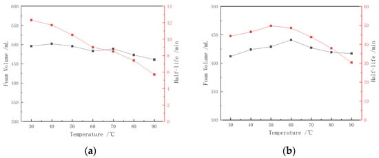 The effects of temperature on the two types of foam are shown in Figure 5. Although the CHSB surfactant has relatively good thermal stability, increasing temperatures still negatively impact foam stability. As shown in Figure 5a, within the temperature range of up to 50 °C, the increase in temperature reduces the viscosity of the solution and enhances the migration speed of surfactant molecules at the gas–liquid interface, thereby lowering the surface tension and increasing foam volume. As a result, the solution exhibits improved foaming ability. However, as the temperature continues to rise, more surfactant molecules form micelles [], leading to a decrease in the number of molecules adsorbed at the gas–liquid interface. This reduces the surface tension gradient, weakening the strength and self-repair ability of the liquid film, causing the foam volume to begin declining [,]. The rise in temperature not only destabilizes the liquid film and increases the probability of film rupture but also accelerates the thermal motion of gas molecules, increasing the coalescence rate between bubbles of different sizes [,]. The drainage half-life of CHSB foam decreases significantly, with the foam half-life at 90 °C being reduced by 54.7% compared to that at 30 °C.