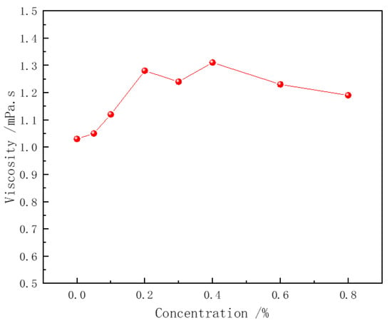 The viscosity of the solution was measured using a modular rheometer (Anton Paar MCR302, Anton Paar GmbH, Graz, Austria). A cone–plate measurement system was employed, with a measurement gap of 0.102 mm and a plate diameter of 105 mm. The shear rate was set at 10 s−1, and all experiments were conducted at room temperature. The viscosity of each sample was tested 3 to 5 times, and the final result was obtained by averaging these measurements.