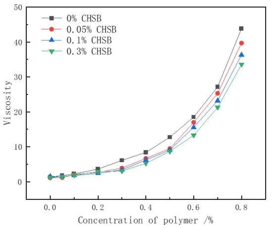 The thickening ability of the polymer is one of the key mechanisms by which it enhances the stability of surfactant foam. In the pure CHSB solution, a minimal effect on the solution’s viscosity was observed with the increase in surfactant concentration (as shown in Figure 6). However, Figure 7 shows that the viscosity of the polymer solution increases exponentially with the polymer concentration, but decreases when a certain concentration of CHSB is added. As the polymer concentration increases, the polymer chains become more entangled, forming a network structure. The number of entanglement points grows non-linearly with the increase in concentration, leading to an exponential rise in the solution’s viscosity. This occurs because CHSB surfactant molecules electrostatically adsorb onto the polymer chains, weakening the electrostatic repulsion and van der Waals forces between the polymer chains [,]. Simultaneously, the hydrophobic tail groups of CHSB interact with the hydrophobic segments of the Z364 polymer chains, further shielding the interactions between the polymer chains. This effect is particularly pronounced under higher concentrations of CHSB [].