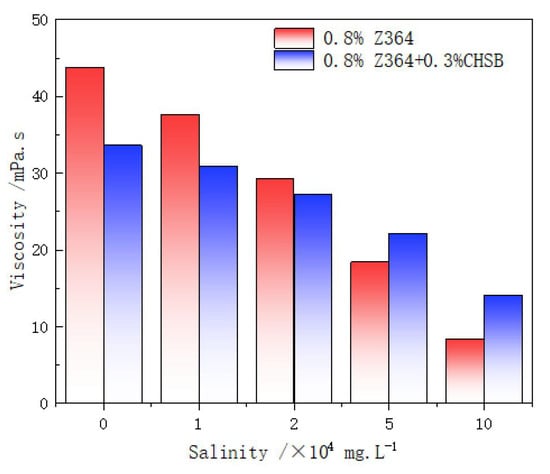 The viscosity of the polymer in synthetic formation water is shown in Figure 8. As the salinity increases, the thickening effect of the polymer significantly decreases. The salt ions in the synthetic formation water shield the negative charges on the polymer, reducing electrostatic repulsion and causing the polymer chains to contract [,]. This effect becomes more pronounced with increasing salinity.