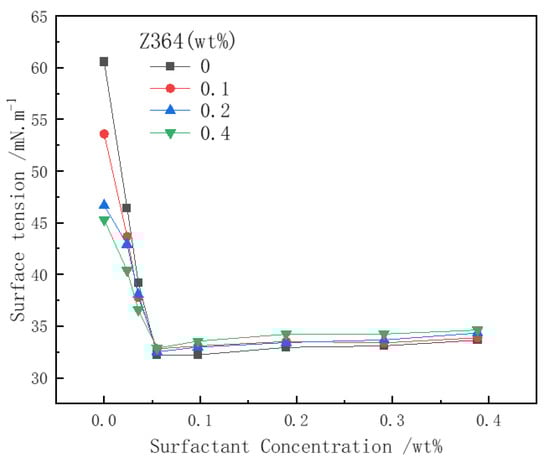 Surface tension is one of the key factors influencing foam generation and stability. It is well known that the lower the surface tension, the less energy is required to form the foam liquid film. The addition of polymers can affect the adsorption state of surfactant molecules at the gas–water interface, thereby influencing foam generation and stability [,]. Figure 9 illustrates the relationship between the surface tension of the surfactant solution with nitrogen and the changes in surfactant and polymer concentrations. As the concentration of CHSB increases, the surface tension of the solution decreases sharply, with the surface tension inflection point occurring at a surfactant concentration of approximately 0.05 wt%. For pure Z364 polymer solutions, the surface tension also decreases with increasing concentration, indicating that the polymer itself possesses some surface activity [,]. In the mixed solution, due to electrostatic interactions and hydrophobic chains, the polymer reduces the adsorption of surfactant at the gas–liquid interface, thereby increasing the surface tension [].